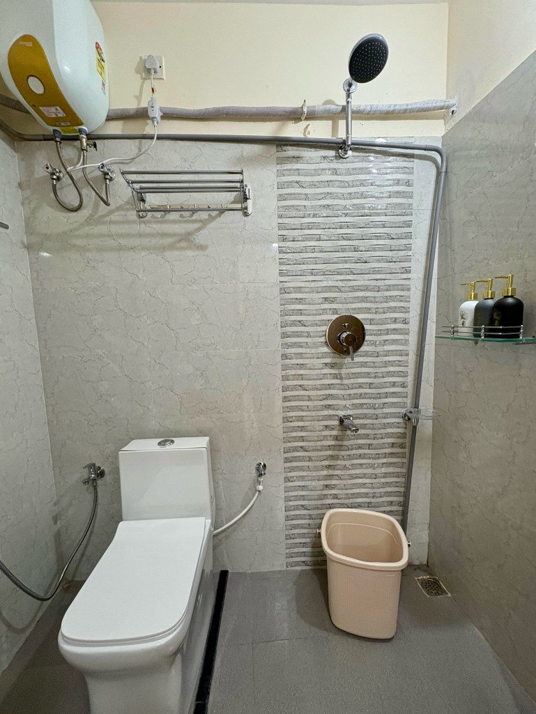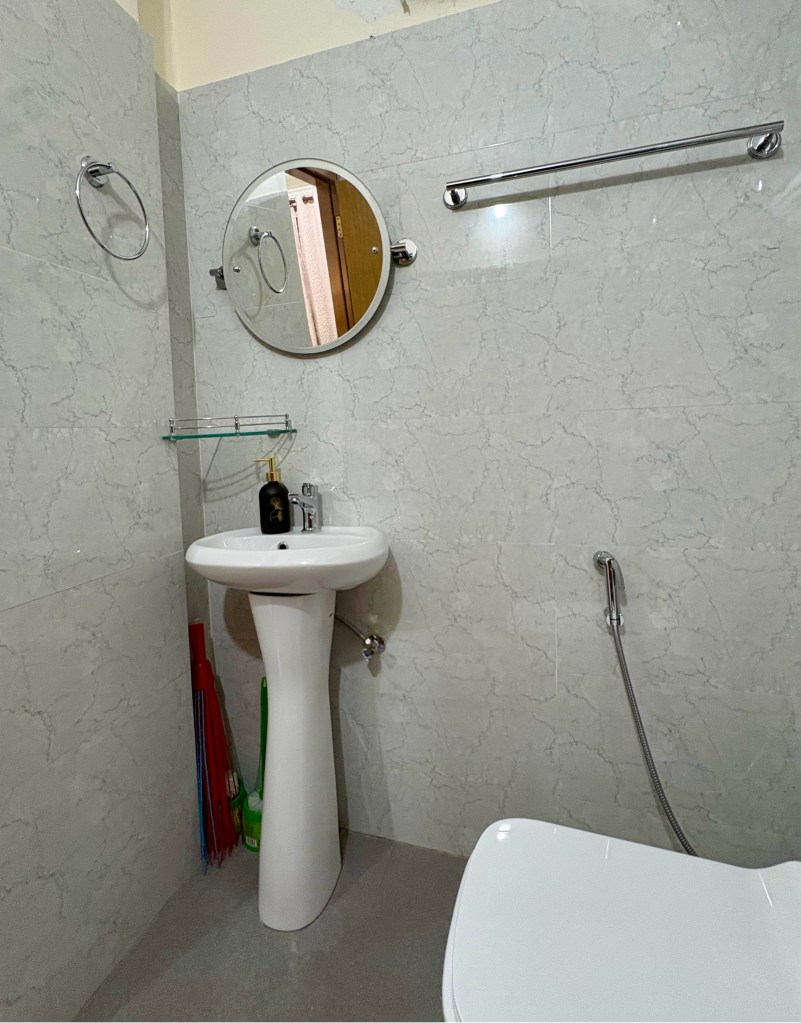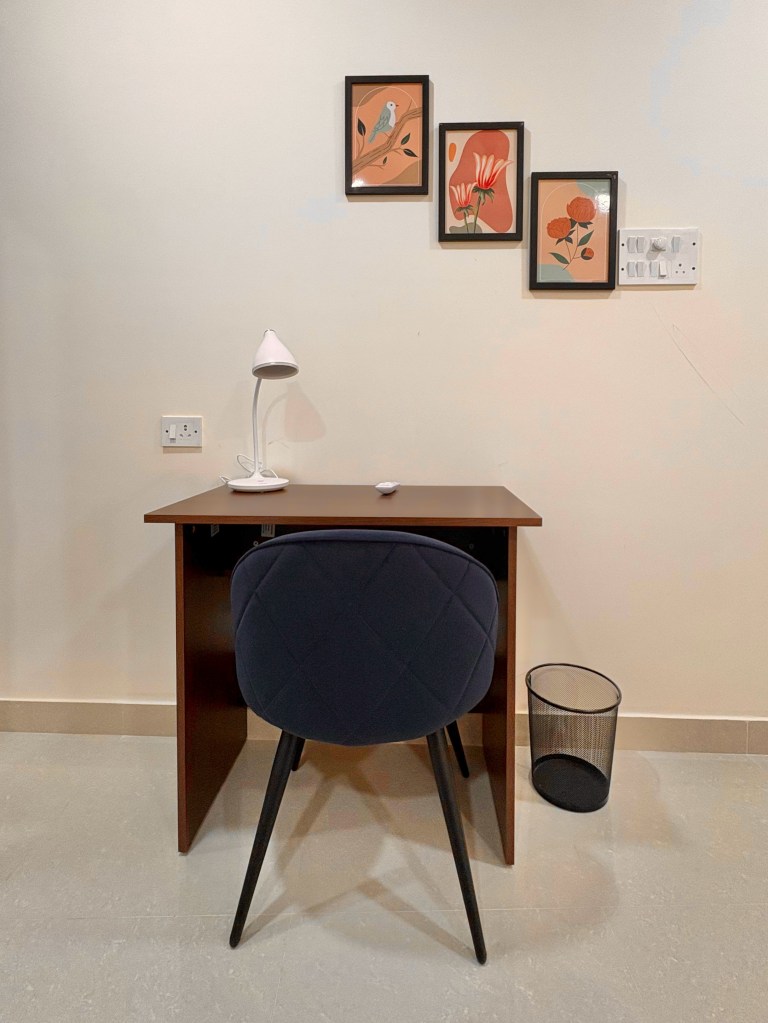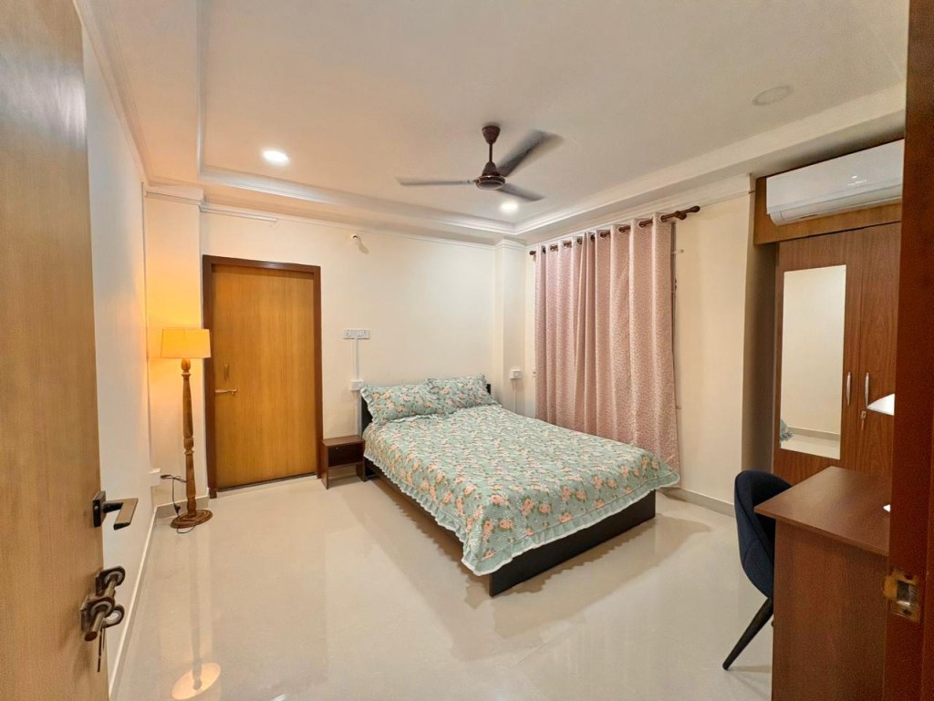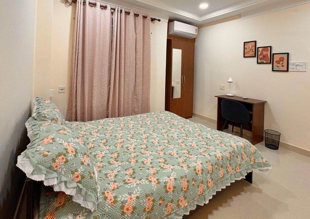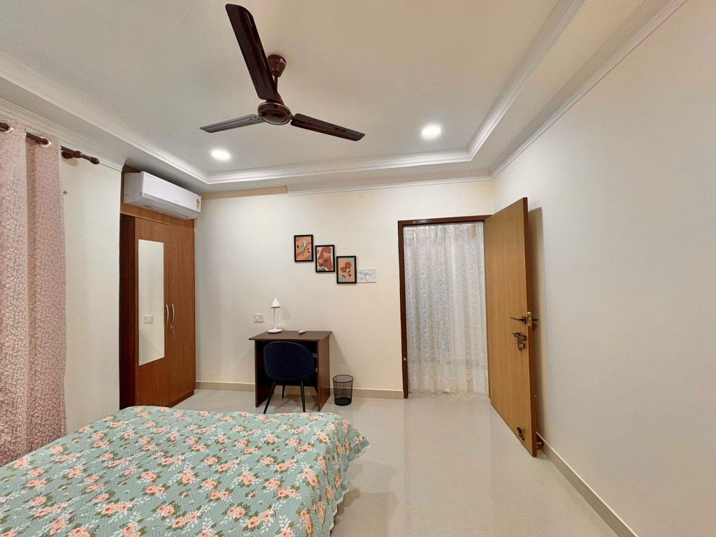 Bedroom 1 is furnished with a queen-sized bed (W62 L79 inches), a study table, table lamp, a floor lamp, a chair, a two-door wardrobe with hangers, and a full-length mirror.