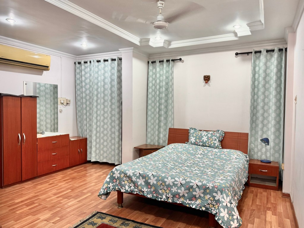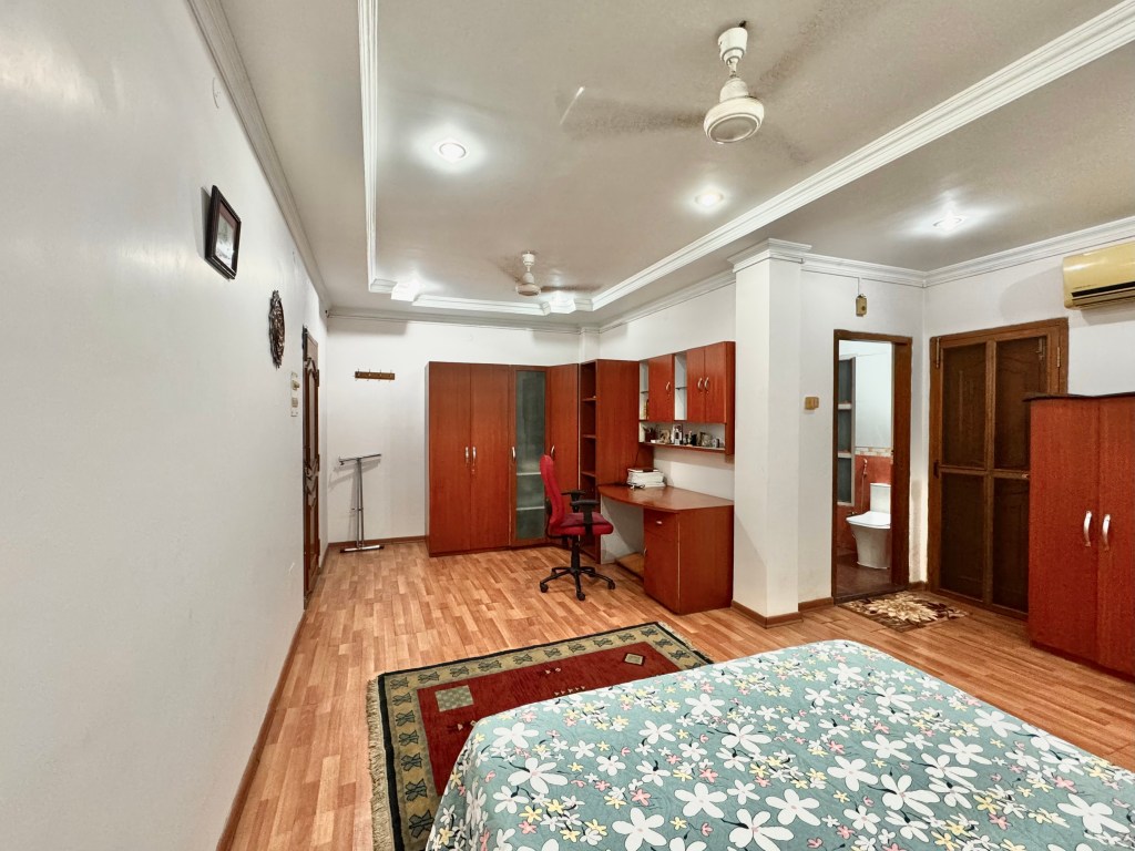 The bedroom is furnished with a queen-sized bed (W60 L78 inches), a large study table, a table lamp, a chair, a large wardrobe with hangers, and a dressing table. There is a full bathroom attached with a geyser.