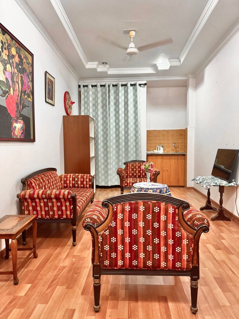 A fully furnished 1 BHK apartment/homestay with 1 bedroom, a full bathroom, a living room, a small pantry and free Wi-Fi.